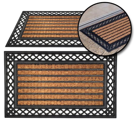 - Wycieraczka wykonana z naturalnych włókien kokosowych i gumy wysokiej jakości, zapewniającej właściwości antypoślizgowe.
