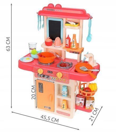 Niesamowita kuchnia z wieloma funkcjami takimi jak zimna para wodna, lecąca z kranu woda, efekty świetlne i dźwiękowe z pewnością zachwycą dziecko gwarantując wielogodzinną zabawę. Posiada wszystko, co jest potrzebne małej gospodyni lub małemu kucharzowi.