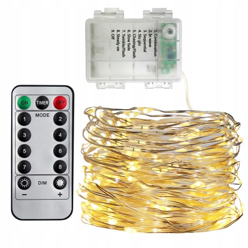 LAMPKI DRUCIKI 100 LED 10M ŚWIATEŁKA NA BATERIE BIAŁE CIEPŁE ŚWIATŁO+ PILOT