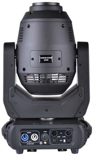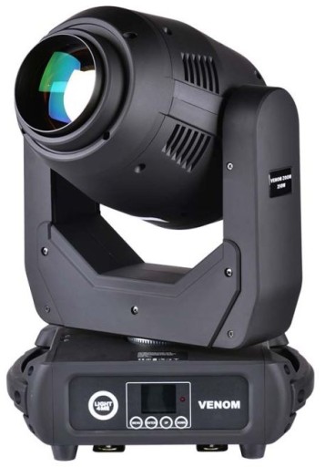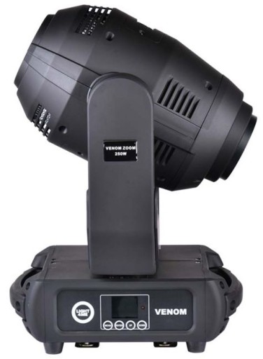Light4Me Venom Zoom 250W V2 to doskonały reflektor sceniczny. Jego podzespoły elektroniczne zamknięte zostały w solidnej, ogniotrwałej obudowie. Jest ona wyposażona w uchwyty umożliwiające łatwe przenoszenie oraz montaż jednostki na kratownicach i rampach oświetleniowych. Ruchoma głowa posiada zainstalowane koło siedmiu kolorów, statyczną oraz rotacyjną tarczę gobo, na których znajduje się łącznie 15 wzorów kształtujących wiązkę, filtr frost, a także 8-ramienny, obrotowy pryzmat rozszczepiający promień światła.