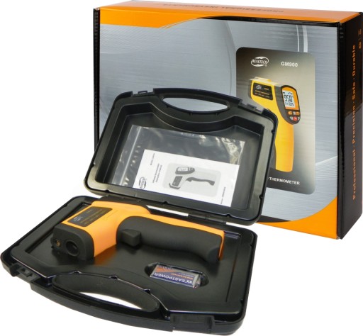 Bezkontaktowy termometr, wysokiej jakości, marki Benetech. Posiada zakres temperatury od -50°C do +950°C. Pirometr wyposażony został w celownik laserowy, który umożliwia precyzyjne wybranie badanego punktu. W urządzeniu zostały zastosowane dobrej jakości materiały, co umożliwia wykonanie pomiaru w ciężkich warunkach. Ergonomiczna budowa poprawia wygodę oraz komfort użytkowania termometru. Podświetlany wyświetlacz umożliwia pracę z urządzeniem w ciemności. Pirometr został wyposażony w funkcję automatycznego wyłączania, zwiększając tym oszczędność w zużyciu w baterii.