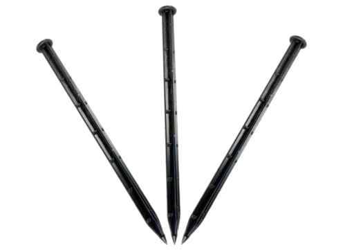 Metalowe gwoździe o długości 25 lub 30 cm stosuje się w kamienistym gruncie lub przy montażu obrzeży przy kostce brukowej (z uwagi na to, że przy kostce brukowej montaż obrzeży jest w podbudowie z kamienia).