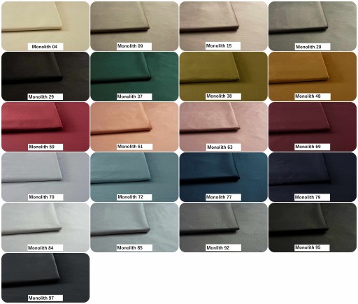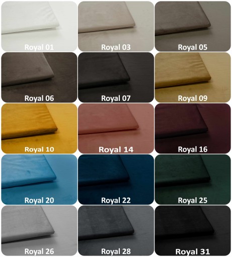 Do wyboru tkanina Velo (welurowa) Monolith (aksamit, gruby welur), Royal (welurowa) lub tkanina Sawana