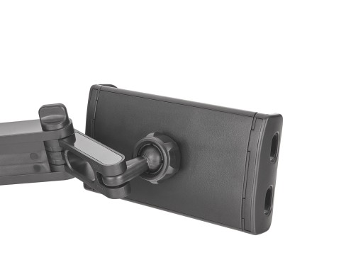 - Uchwyt umożliwia płynną regulację położenia urządzenia w poziomie, co zapewnia idealne ustawienie ekranu dla komfortowego korzystania z telefonu lub tabletu.