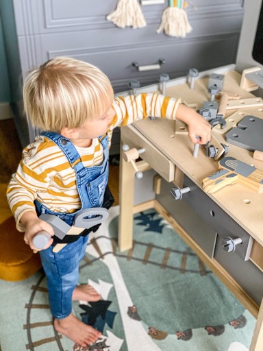 Mała pracownia dla Twojego malucha została starannie odtworzona, wyposażona w pierwotne narzędzia które tata czy dziadek mają w swoim warsztacie. Narzędzia zostały wykonane z drewna i są w pełni bezpieczne podczas zabawy.