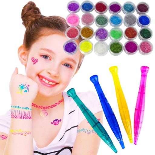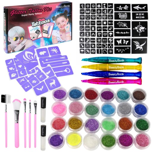 Wybierz spośród trzech brokatów ciała, sześciu szablonów i dwunastu transferów tatuaży, aby stworzyć wielokolorowy, brokatowy tatuaż, który będzie wyjątkowy.
