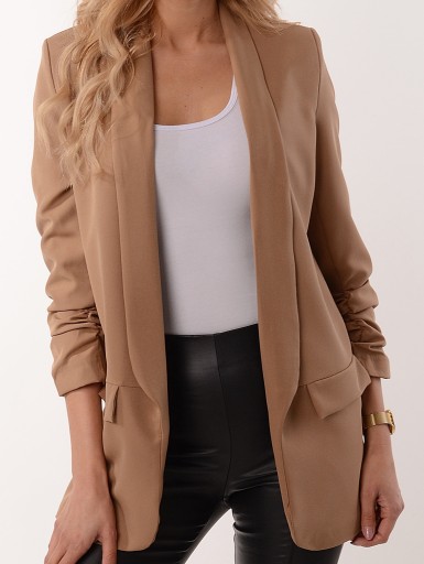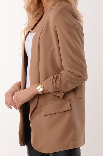 Doskonałe dopełnienie stylizacji do pracy, na uczelnie lub na wieczorne wyjście. Oryginalnego charakteru dodają drapowane rękawy o długości 3/4. Imitacja kieszonek po bokach z efektownymi klapami upiększają marynarkę. Fason luźny, z podszewką i miękkimi poduszkami w ramionach.