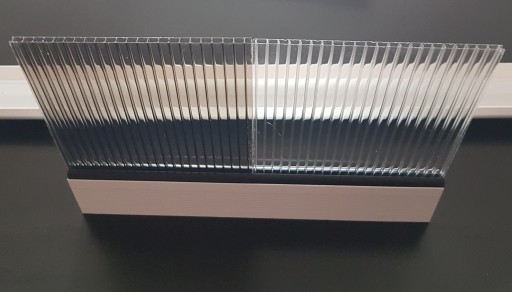 Zadaszenie płaskie z profilem przyściennym i uszczelką chroniącą mur przed zaciekaniem wody opadowej, oraz rynną odprowadzającą wodę na boki, płyta poliwęglanowa z obustronnym filtrem UV- płyta w ramce aluminiowej, wsporniki aluminiowe.