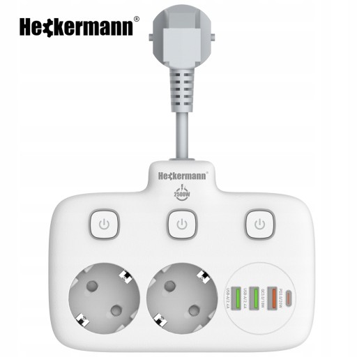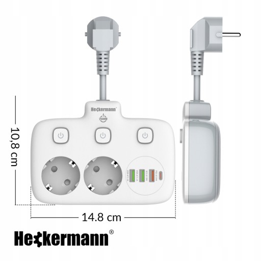 ⭐ Listwa posiada dwa standardowe gniazda elektryczne, kompatybilne z wtyczkami europejskimi, dwa standardowe USB, jeden USB z funkcją szybkiego ładowania (Quick Charge 3.0), a także jeden port USB-C PD 20W.
