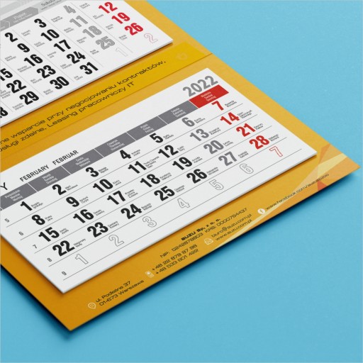 - kalendaria: 295 x 210 mm, offset 80g, zadruk 2/0 (czerwono-czarne)
