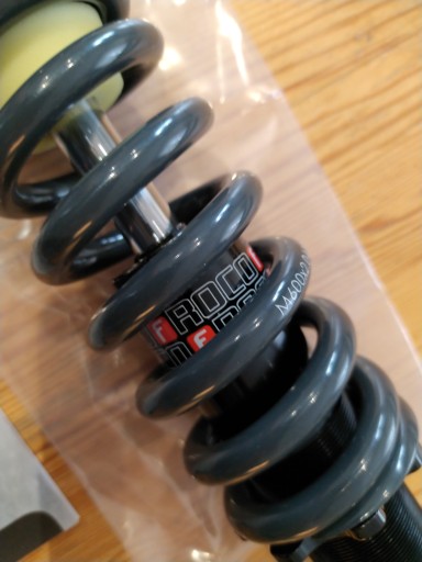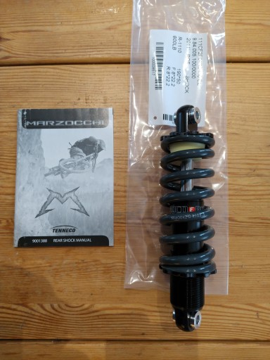 Witam serdecznie. Przedmiot oferty stanowi nieużywany amortyzator tylny Marzocchi Roco F w rozmiarze 190x50mm. Sprężyna stalowa 600lbs. Tulejki w damperze są o szerokości 22,2mm i pod śrubę 8mm (można je zdjąć we własnym zakresie i zamontować inne).