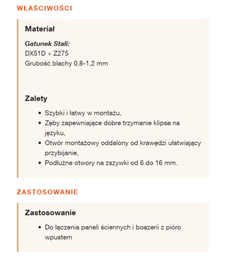 Klips do ukrytego połączenia paneli boazeryjnych lub paneli elewacyjnych z pióro wpustem. Montaż jest łatwy i szybki bez żadnych specjalistycznych narzędzi. Może być mocowany za pomocą gwoździ dołączonych do zestawu lud zszywek.