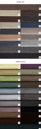 Wzornik z kolorami tkanin jest materiałem poglądowym i nie stanowi podstawy do reklamacji. Ze względu na ograniczenia wynikające z technologii oraz indywidualnych ustawień monitora, kolory mebli oraz tkanin ukazane na ekranie monitora mogą różnić się od rzeczywistych kolorów oferowanych mebli.