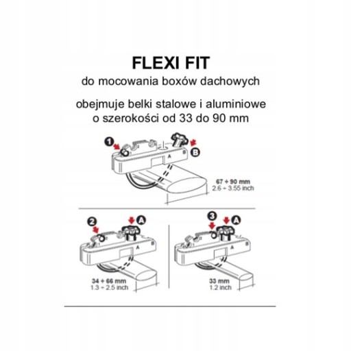 - Posiada możliwość regulacji, która pozwala na montaż box'ów na belkach o wysokości od 20 do 67 mm oraz szerokości od 33 do 90 mm