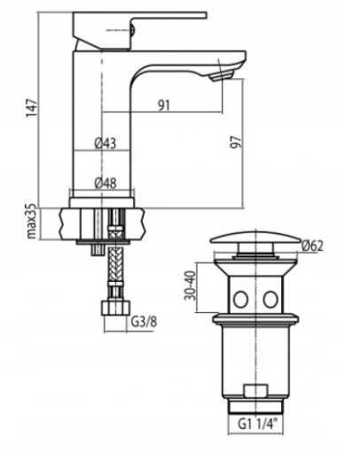 W komplecie:bateria, wężyki, zestaw montażowy, korek klik klak