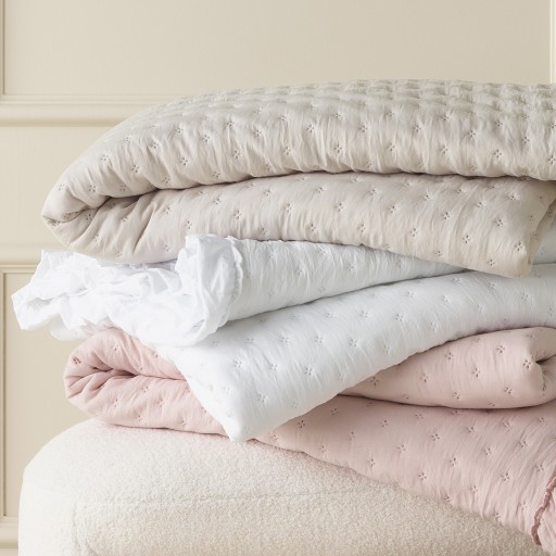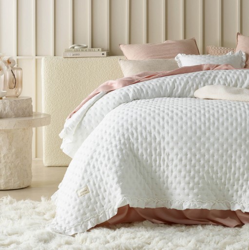 Narzuta na łóżko Molly - lekka, otulająca swoim ciepłem kolekcja, która to kumuluje w sobie cały zbiór starannie zaprojektowanych detali. Zachwyci Cię subtelnymi pikowaniami i uroczą falbaną, która zdobi jej boki.