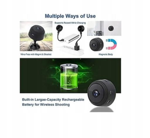 [HD 1920X1080 P]--Mini kamera ma profesjonalny szklany obiektyw optyczny. Obraz jest jasny i wyraźny, oszałamiająca jakość wideo HD (1920 x 1080p, 30 klatek na sekundę), otrzymujesz wyraźny obraz z większą ilością szczegółów.^[Wideo w pętli]--Obsługuje nagrywanie w pętli oraz nagrywanie i odtwarzanie z lokalnym Karta micro SD (brak w zestawie). Wystarczy włożyć kartę micro SD, aby rozpocząć nagrywanie. Możesz umieścić kamerę w rogu domu, biura, magazynu, sklepu, podwórka, ogrodu, łazienki, sypialni. ^ [Funkcja noktowizyjna] --- Mini kamera bezpieczeństwa to ukryta konstrukcja 2 diod LED na podczerwień, odległość widzenia w nocy może osiągnąć do 5 metrów. Automatycznie aktywuj/dezaktywuj noktowizor, gdy zmieni się otoczenie. ^ [Mini kamera] --- Ta mini kamera jest przenośna i kieszonkowa, co czyni ją idealną jako bezprzewodowa kamera bezpieczeństwa w domu lub kamera gospodyni/niania/niania z kamerą do nagrywania zarówno Zrób zdjęcie i filmy bez przyciągania uwagi. ^ [Łatwe połączenie Wi-Fi]--Ten mini aparat ma tylko 2,4 GHz, możesz przesyłać strumieniowo wszystkie swoje filmy na telefon lub tablet (dostępny na iOS i Android) do zdalnego podglądu, gdy wychodzisz z domu . Miej oko na swój dom, biuro lub rodzinę jako gospodyni lub niania przed kamerą 24 godziny/7 dni.