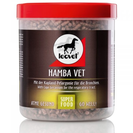 Preparat na drogi oddechowe dla koni Leovet Hamba Vet to skuteczny środek o działaniu leczniczym stosowany w chorobach układu oddechowego koni. Znacząco wzmacnia odporność i wspiera leczenie bakteryjnych i wirusowych infekcji dróg oddechowych. Jego złożony skład wzbogacony jest działaniem rzadkiej południowoafrykańskiej rośliny stosowanej tradycyjnie w leczeniu kaszlu: Kapland-Pelargonia (renifrome-sidoides). To najwyższej jakości preparat ułatwiający koniom swobodne oddychanie.
