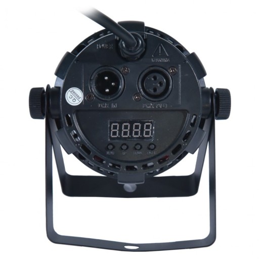 W części tylnej korpusu zainstalowany jest przewód zasilania, gniazda DMX (in/out) oraz intuicyjny panel sterowania w postaci wyświetlacza LED i czterech przycisków. Dzięki nim możemy wybrać jeden z kilku trybów pracy urządzenia: