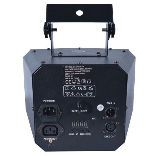 SIX EYE BEAM posiada również wygodny uchwyt montażowy, dzięki któremu może być instalowany na statywach, kratownicach i rampach oświetleniowych. To łatwe w obsłudze i stosunkowo tanie oświetlenie efektowe o bardzo szerokim spektrum zastosowań. Świetnie sprawdza się jako efekt centralny lub uzupełniający dla DJ-ów, zespołów muzycznych czy podczas mniejszych eventów.