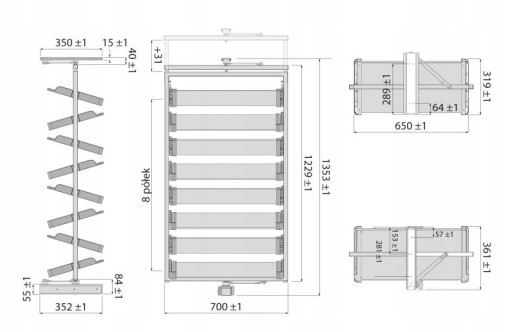 - Szerokość systemu po obróceniu pólek frontem:+/- 701mm