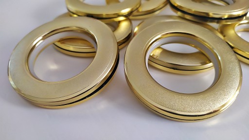 Plastikowe przelotki do firan i zasłon w złotym kolorze.