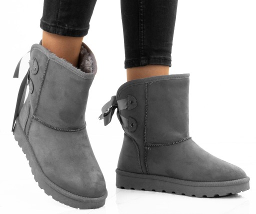Damskie ocieplane śniegowce za kostkę, wykonane ze skóry ekologicznej zamszowej. Z tyłu cholewki ozdobne kokardki. Buty na płaskiej podeszwie. Wygodny model, sprawdzi się idealnie na zimę!