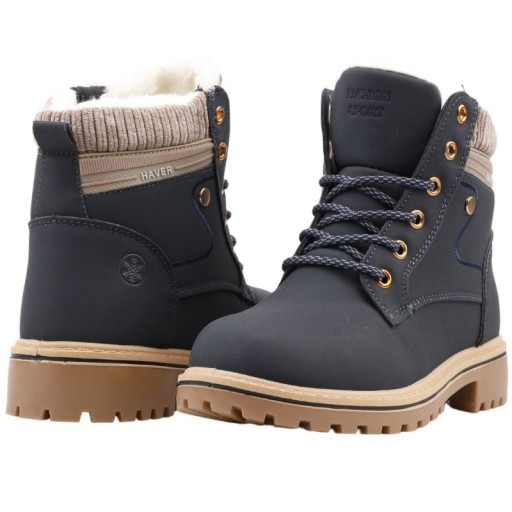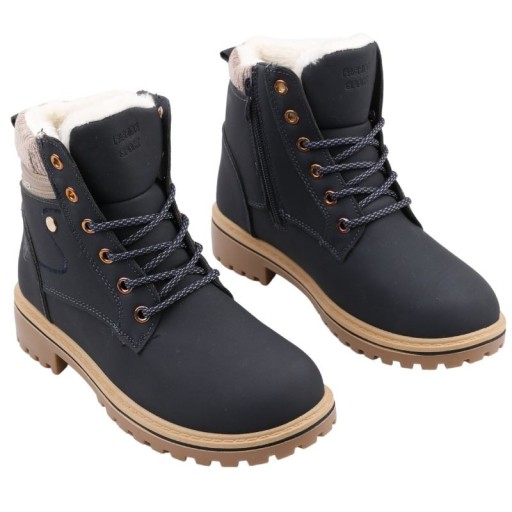 Traperki damskie z cholewką za kostkę. Okrągły, smukły nosek. Osadzone na płaskim obcasie i podeszwie z klasycznym bieżnikiem. Z przodu wiązanie, po wewnętrznej stronie zamek błyskawiczny. Wykonane z ekoskóry. Ocieplone imitacją futerka. Idealne będą się komponowały z kurtką zimową.