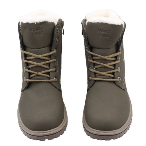 Traperki damskie z cholewką za kostkę. Okrągły, smukły nosek. Osadzone na płaskim obcasie i podeszwie z klasycznym bieżnikiem. Z przodu wiązanie, po wewnętrznej stronie zamek błyskawiczny. Wykonane z ekoskóry. Ocieplone imitacją futerka. Idealne będą się komponowały z kurtką zimową.