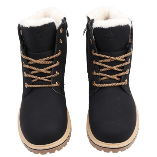 Traperki damskie z cholewką za kostkę. Okrągły, smukły nosek. Osadzone na płaskim obcasie i podeszwie z klasycznym bieżnikiem. Z przodu wiązanie, po wewnętrznej stronie zamek błyskawiczny. Wykonane z ekoskóry. Ocieplone imitacją futerka. Idealne będą się komponowały z kurtką zimową.