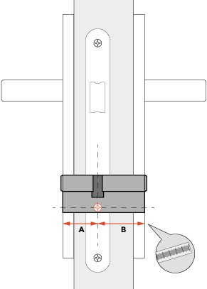 a) Pomiarze odległości od śruby montażowej wkładki (oś zamka do drzwi) do pierwszej krawędzi drzwi - jest to wymiar A do którego należy dodać grubość szyldu 1.1cm. Otrzymana suma jest minimalnym wymiarem A wkładki.
