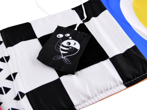 Posiada wszyte elementy szeleszczące, lusterko, długie materiałowe tasiemki, ruchome elementy oraz różne faktury materiałów na kolorowych obrazkach - wszystko po to aby jak najlepiej stymulować i rozwijać wszystkie zmysły maluszka od pierwszych miesięcy życia.