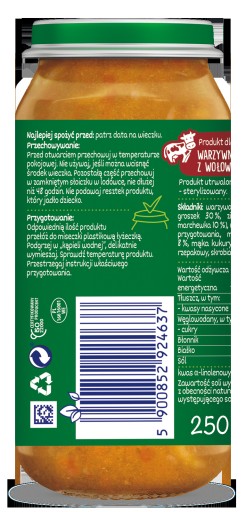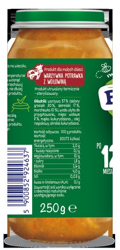 zielony groszek 30%, woda, ziemniaki 18%, marchewka 10%, mięso wołowe 8%, mąka kukurydziana, olej rzepakowy, skrobia kukurydziana