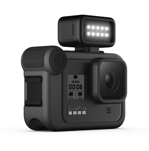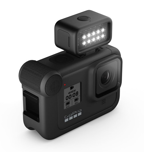 Kamera sportowa GoPro Hero 8 Black oferuje system modułowych akcesoriów, które poszerzają jej funkcjonalność. Należy do nich m.in. Light Mode, który stanowi bardzo mocne oświetlenie LED. Jest to niezwykle przydatne akcesorium zarówno w trakcie filmowania, jak i fotografowania. Light Mode oferuje szerokie i zrównoważone oświetlenie.