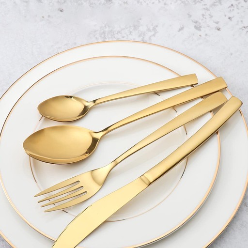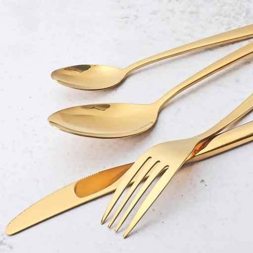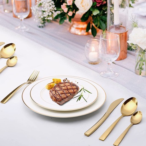 🍗 Klasyczny design: Wyjątkowo wykwintny nóż stołowy i smukły uchwyt pokazują wyjątkową osobowość tego zastawy stołowej. Wykwintna matowa złota powłoka tytanowa sprawia, że potrawy są bardziej eleganckie i luksusowe, a także zapewniają odporność na rdzę i zarysowania.