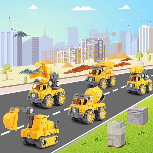 🧩 Zestaw 5 w 1——Wyposażony w 5 samochodzików, koparkę, betoniarkę, ciężarówkę do kamieniołomów, chwytak do drewna i wiertarkę. Możliwe jest także połączenie 5 samochodów w jednego robota.