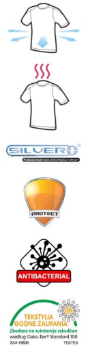 Skład: Poliester o specjalnej, mikrokanałowej strukturze z 20% domieszką ThermoCool. Zapewnia doskonałą wentylację jednocześnie utrzymując optymalną temperaturę ciała. Dodatkowo na etapie permanentnego wykończenia materiału - wzbogacony o jony srebra (czynnik bakteriostatyczny) zapobiegający powstawaniu nieprzyjemnych zapachów.