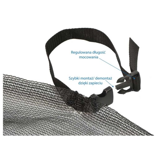 ✔️ 6 grubych na 2 cm, mocnych uchwytów mocowanych na słupki stelaża, rozpościera siatkę na trampolinie