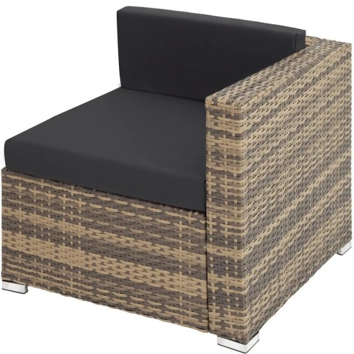 Nasz zestaw z polirattanu składa się ze stołu, kanapy, fotela i hokera. Powierzchnia stołu wykonana ze szkła wygląda bardzo elegancko i jest łatwa w czyszczeniu. Bardzo wygodne, wykonane z poliestru poduszki siedziska dopasowane zostały do koloru mebli, z tylu zapinane są na zamek błyskawiczny, dzięki czemu można łatwo wyczyścić poszewkę. W celu ochrony poduszki przed wnikaniem wilgoci, powierzchnia poszewek została zaimpregnowana, więc brud i krople wody po prostu spływają (patrz zdjęcie). Dzięki kompaktowej budowie zestaw może być indywidualnie dopasowywany.