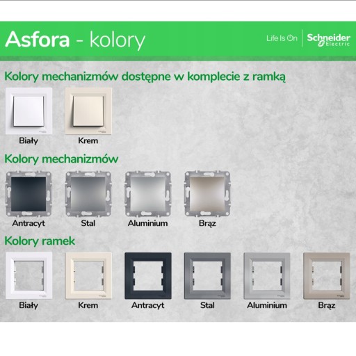 Produkty serii Asfora Schneider Electric mają szeroki zakres funkcji (łączniki jednobiegunowe, łączniki świecznikowe, gniazda 2P+PE, gniazda R-TV-SAT, gniazda 2P+PE IP44 w ramce podwójnej). Sterujesz żaluzjami, dzięki podświetleniu z łatwością znajdziesz łącznik światła w ciemności, a także tworzysz nastrój w salonie czy sypialni, stosując ściemniacze. Masz dostęp do mediów (gniazda R-TV-SAT, gniazda RJ45) i cieszysz się doskonałą jakością dźwięku (gniazda głośnikowe, przewody estetycznie ukryte w ścianie). Osprzęt elektroinstalacyjny Asfora z tak szerokim zakresem funkcji ułatwia i uprzyjemnia życie. Asfora Schneider Electric to klasyka w dobrej cenie!