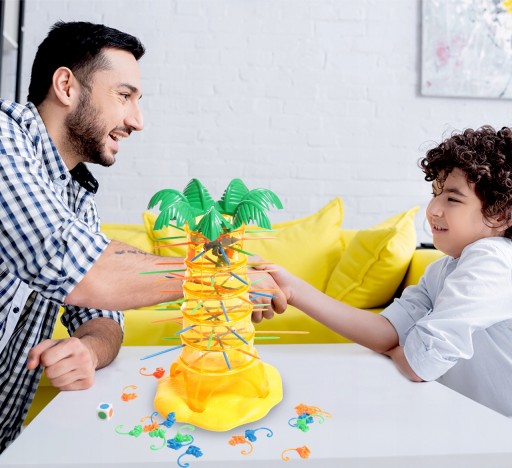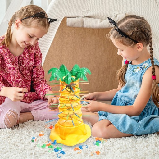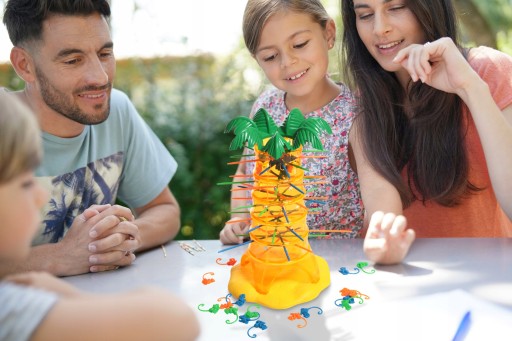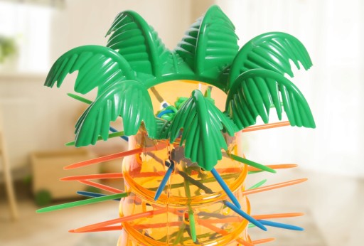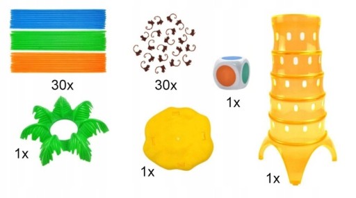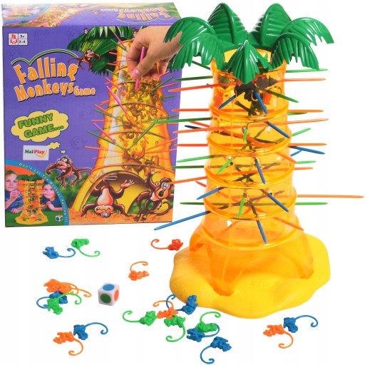 ⭐Oferujemy GRE SPADAJĄCE MAŁPKI idealną alternatywę dla gier komputerowych. Wspaniała gra ćwicząca zręczność oraz koncentrację dzieci. Gracze wkładają różnokolorowe patyczki w pień palmy, a następnie wrzucają do środka palmy małpki, które zahaczają się o patyczki ogonami. Gracz rzuca kostką do gry z kolorowymi polami. Kolor wylosowany kostką do gry wyznacza kolor patyczka, który gracz musi wyciągnąć z palmy. Cała sztuka polega na tym, aby wyciągnięciu patyczka nie spadała żadna małpka!Wygrywa - ten kto zbierze najmniej małpek.