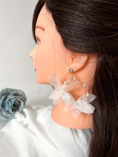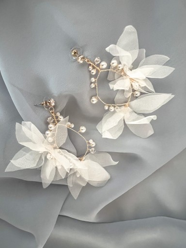 Delikatne lecz spektakularne kolczyki z listkami z tiulu, perłami, kryształkami i cyrkonią to idealna propozycja dla nowoczesnej i romantycznej panny młodej lub druhny. Wpasowują się w styl boho glam, romatyczny, fairytale lecz również urban chic.