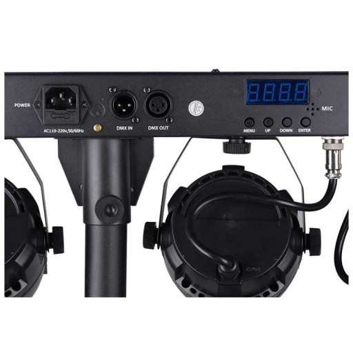 W komplecie znajdują się wytrzymały statyw, listwa mocująca oraz dwa wielokolorowe reflektory LED PAR (12x1W RGBW) i dwa efekty oświetleniowe LED flower (1x10W RGBW) podłączone na stałe do belki, zapewniające szeroki kąt świecenia. Pracę całości możemy kontrolować ręczenie wykorzystując znajdujący się na listwie panel sterowania LED i cztery przyciski (Menu, Up, Down, Enter), za pośrednictwem bezprzewodowego pilota lub za pomocą sterowników DMX (gniazda in/out). Urządzenie posiada również wbudowany tryb pracy automatycznej i sterowania dźwiękiem (wbudowany mikrofon).
