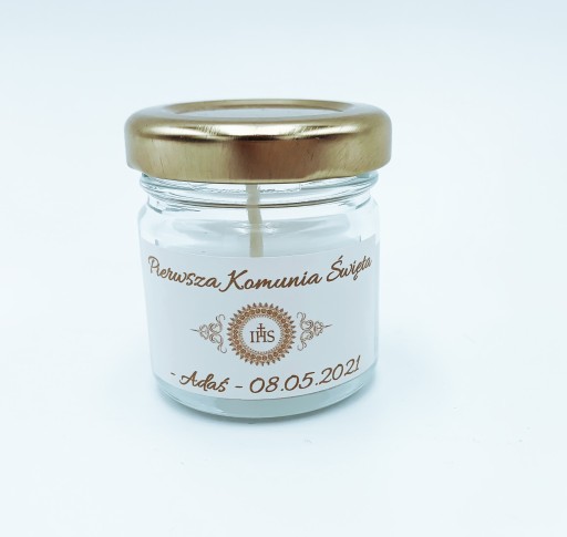Na słoiczku naklejona jest etykieta z napisem "Pierwsza Komunia Święta!" wraz z imieniem i datą. Na etykiecie znajduje się ozdobna grafika.