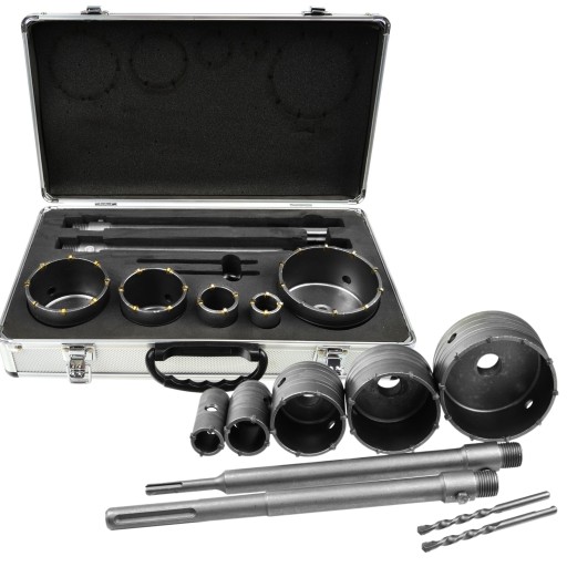 Zestaw otwornic / koron wiertarskich renomowanej marki GEKO wykonanych z materiałów najwyższej jakości. Wieniec zębaty otwornic wykonany został z węglików spiekanych. W skład zestawu wchodzi 5 koron wiertarskich w rozmiarach 30 – 100 mm, dwa wiertła prowadzące oraz dwa adaptery o długości 300 mm z mocowaniem typu SDS PLUS / SDS MAX. Otwornice tego typu przeznaczone są do wykonywania otworów pod instalacje elektryczne (puszki, gniazdka itp.) w różnego typu materiałach budowlanych takich jak np. beton, płyty gipsowo-cementowe, płyty gipsowe, cegła, glazura itp.
