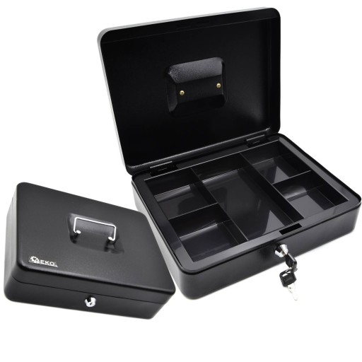 Metalowa kasetka na pieniądze. Zamykana na kluczyk (2 szt. w zestawie). Wyposażona w uchwyt do przenoszenia. W środku plastikowa wkładka z przegródkami: