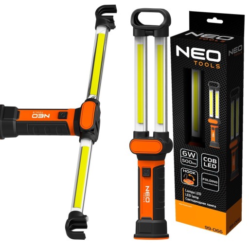 Lampa warsztatowa akumulatorowa NEO (nr ref. 99-066) wyposażona jest w diody COB LED o strumieniu świetlnym 500 lumenów oraz mocy 6W. Zasilana jest dołączonym do zestawu akumulatorem 3.7V Li-Ion o pojemności 2400 mAh. Składana konstrukcja pozwala na ustawienie lampy według potrzeb użytkownika. Lampa posiada hak dzięki czemu można przechowywać ją również w pozycji wiszącej.