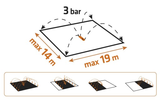 Zraszacz oscylacyjny, 15-771, NEO, przeznaczony jest do nawadniania trawników, ogrodów i upraw. Umożliwia jednoczesne podlewania roślin na powierzchni 14x19 m. Został wyposażony w 18 dysz wylotowych, umieszczonych na metalowym pałąku. Zraszacz ma suwaki, które dają możliwość ustawienia jego zakresu ruchów. Dodatkowo urządzenie ma pokrętło, które pozwala na regulację siły strumienia, co ułatwia zmianę zasięgu zraszania.