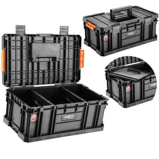 Modularna, wytrzymała skrzynka narzędziowa z poliamidowymi zapięciami i solidną rączką. Duża pojemność i dwie regulowane przegrody zapewniają komfort przechowywania różnych narzędzi. Możliwość łączenia z innymi modułami. Maksymalna ładowność 19 kg.