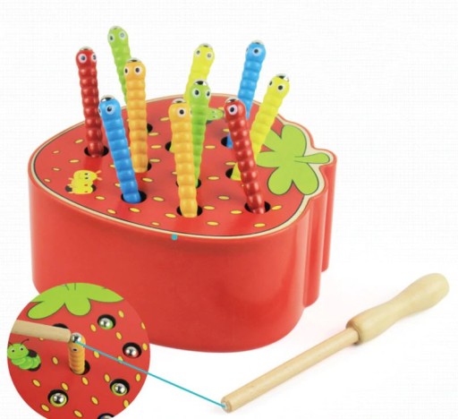 Ta wyjątkowa gra drewniana to doskonały pomysł na zajęcie malucha. Zabawa polega na chwytaniu drewnianym kijkiem zakończonym magnesem robaczków ukrytych w otworkach znajdujących się w owocu a następnie na ich ponownym wkładaniu. Jest to spore wyzwanie dla malucha, które wymaga skupienia uwagi oraz sprawności manualnej.